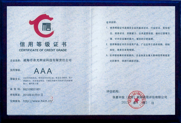 |   凌海市農(nóng)光種業(yè)科技有限責(zé)任公司是由遼寧省種子管理局和凌海市人民政府批準(zhǔn),集科研、生產(chǎn)、試驗(yàn)示范、經(jīng)營為一體的種子企業(yè)。 公司擁有種子繁育基地3萬畝,年產(chǎn)種子1200萬公斤左右。自成立以來在農(nóng)業(yè)部及遼寧省歷次花期檢驗(yàn)中,所生產(chǎn)的種子質(zhì)量合格,擁有良好的儲(chǔ)備、晾曬和機(jī)械加工設(shè)備,為了提高種子質(zhì)量,2015年新購置種子脫粒機(jī)、清選機(jī)、烘干機(jī)以及電腦包裝機(jī)等整套加工設(shè)備,擁有經(jīng)省技術(shù)監(jiān)督局認(rèn)證的“標(biāo)準(zhǔn)化檢驗(yàn)室”,投資20萬元購買人工氣候室、土壤測試儀、低溫低濕冷藏箱等各種檢驗(yàn)設(shè)備。公司重視種子科研工作,現(xiàn)有科研育種實(shí)驗(yàn)基地100畝,科研上以自主研發(fā)為主,同時(shí)與多家科研單位合作育種,每年繁、育、測交材料2000多份,現(xiàn)以推出五個(gè)組合參加錦州區(qū)域試種,其中“農(nóng)光3號(hào)、農(nóng)光4號(hào)”在錦州地區(qū)試驗(yàn)中產(chǎn)量居首位。2006年公司買斷的連玉16玉米品種已通過5個(gè)省市的審認(rèn)定,具有適應(yīng)性廣、抗逆性強(qiáng)、產(chǎn)量高的特點(diǎn),曾榮獲大連科技進(jìn)步一等獎(jiǎng),深受廣大農(nóng)戶的歡迎。2008年公司新選育的農(nóng)光4000玉米品種在市種子管理站新品種大區(qū)試驗(yàn)項(xiàng)目中。2012年公司買斷錦玉118品種權(quán),新品種的推廣與應(yīng)用為公司的發(fā)展提供了充足的動(dòng)力......  |